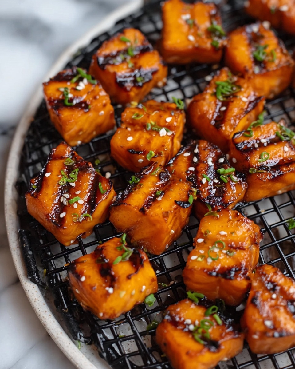 - Garnish and Serve: Once cooked, remove the salmon bites and garnish with sesame seeds and chopped green onions if desired. Serve immediately for the best taste and texture.