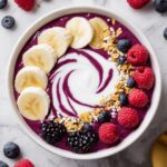 - Combine Ingredients: In a blender, add the frozen mixed berries, frozen banana slices, Greek yogurt, milk, and honey or maple syrup if using. These ingredients will form the creamy base of your smoothie bowl.