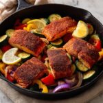 A flavorful and healthy Blackened Salmon dish paired with smoky roasted vegetables, offering a perfect balance of spices and fresh produce. The salmon is seared to a blackened crust on the stovetop while the colorful medley of zucchini, red bell peppers, and red onions is roasted for a tender, caramelized side.