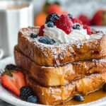 Fresh berries like strawberries, blueberries, or blackberries add a juicy tartness that perfectly counters the richness of the toast. A light dusting of powdered sugar lends a snowy sweetness and an elegant touch, while pure maple syrup glazes everything with sticky warmth.