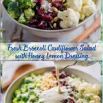 A vibrant and crunchy Broccoli Cauliflower Salad featuring fresh florets, dried cranberries, and toasted almonds or pine nuts, tossed in a sweet and tangy honey-lemon mayonnaise dressing. Perfect as a refreshing side dish for any meal.