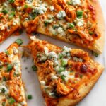 Once your pizza is out of the oven, allow it to cool just slightly to let the cheese set. Then, garnish with sliced green onions, a drizzle of extra blue cheese or ranch dressing, and even a splash of hot sauce if you’re craving more heat. Slice it up and dig in while warm — the combination of spicy, creamy, and crispy is truly unbeatable.