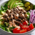 This Burger in a Bowl recipe offers a delicious, low-carb twist on the classic burger by serving all the favorite flavors over a fresh bed of romaine lettuce. Ground beef is seasoned and cooked on the stovetop, then combined with a creamy, tangy sauce and fresh toppings like avocado, red onion, pickles, and cherry tomatoes for a satisfying and quick meal.