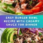 Finally, drizzle your homemade sauce generously over the bowl and serve immediately. This Burger in a Bowl Recipe shines best when fresh, with all the contrasts of warm, cool, creamy, and crunchy harmonizing on your plate.