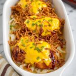 This Cheesy BBQ Chicken recipe features tender chicken breasts seasoned with a flavorful spice blend, topped with tangy barbecue sauce, melted cheddar cheese, and crispy fried onions. Baked to perfection, this dish offers a delightful combination of smoky, savory, and cheesy flavors that are perfect for a quick and satisfying weeknight dinner.