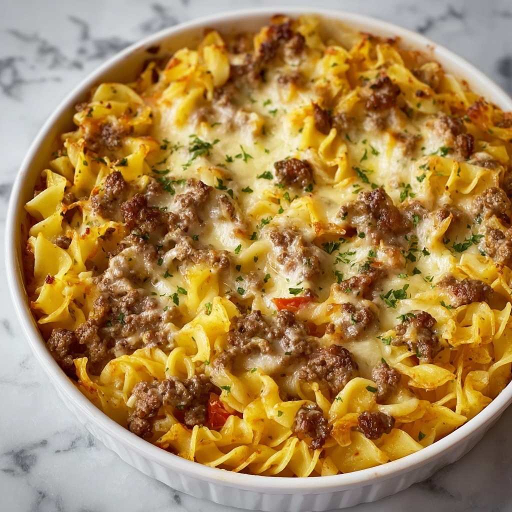 A comforting Cheesy Beef and Noodle Casserole featuring seasoned ground beef, tender egg noodles, and a creamy tomato cheese sauce baked to perfection. This hearty dish combines savory tomato flavors with rich cheddar and Parmesan cheeses, making it a perfect family-friendly meal for weeknights or gatherings.