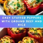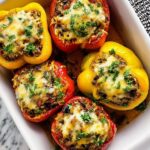 These Stuffed Peppers feature tender roasted bell peppers filled with a savory mixture of ground beef, fire-roasted tomatoes, spinach, and rice, topped with melted Monterey Jack or cheddar cheese for a delicious and hearty meal.