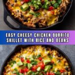 This Cheesy Chicken Burrito Skillet is a flavorful, all-in-one Mexican-American dish featuring tender chicken, seasoned rice, black beans, corn, and diced tomatoes with green chilies. Topped with melted cheddar and Monterey Jack cheese, fresh cilantro, avocado slices, sour cream, and lime wedges, it’s a comforting and easy skillet meal perfect for weeknight dinners.