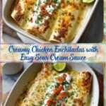 These Chicken Enchiladas with Sour Cream White Sauce combine tender shredded chicken and melted Monterey Jack cheese wrapped in soft flour tortillas, baked in a creamy, tangy sauce made with sour cream, chicken broth, and diced green chilies. This comforting Mexican-inspired casserole is perfect for a family dinner or casual gathering and garnished with fresh cilantro or green onions for a burst of freshness.