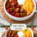 This hearty Chipotle Chili with Steak is a flavorful twist on classic chili, featuring tender flat iron steak simmered with chipotle peppers in adobo sauce, kidney beans, and a blend of spices. Perfect for a comforting weeknight meal, it combines smoky heat with rich tomato flavors and is deliciously topped with sour cream and shredded cheddar cheese.