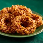 These Christmas Wreath Cookies are a festive, no-bake treat perfect for the holiday season. Made with buttery marshmallow-coated cornflakes dyed green and decorated with red cinnamon candies or mini M&Ms, they are quick to prepare and delightfully crunchy. Their charming wreath shape makes them a fun and colorful addition to any holiday cookie platter.