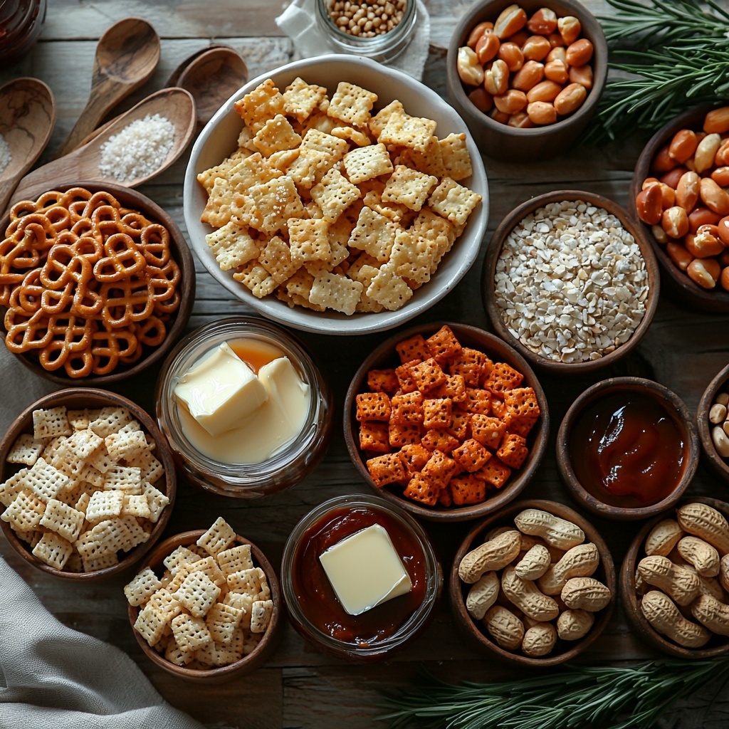 These ingredients are deceptively simple yet completely essential; each one adds its own texture, flavor, or color, elevating the mix to something truly special. From the trio of Chex cereals that form the crunchy base, to the melty mixture of butter and sauces that bring everything together—you’ll appreciate how thoughtful each component is.