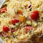 Pour the dressing over the pasta and veggie mixture gradually. Toss everything gently but thoroughly so every strand of spaghetti and every chunk of vegetable is glistening with that zesty dressing. This ensures each bite delivers consistent flavor from start to finish.