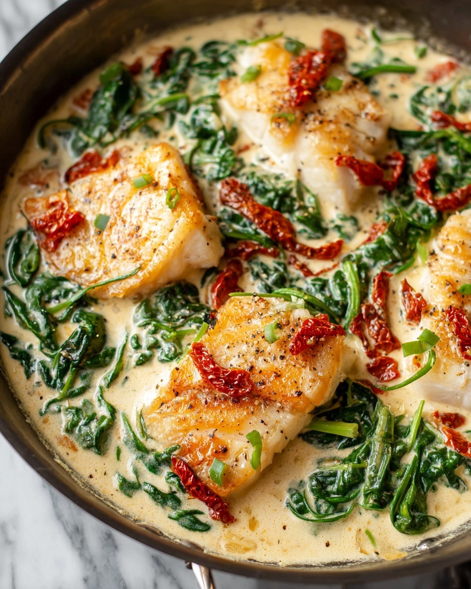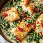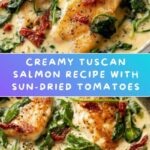 This Creamy Tuscan Salmon recipe delivers a rich and flavorful dinner featuring tender salmon fillets cooked to perfection and served with a luscious sauce of sun-dried tomatoes, fresh baby spinach, cream, and aromatic herbs. Quick to prepare and perfect for a weeknight meal, this dish combines Mediterranean-inspired flavors with a creamy, comforting texture.