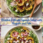 A vibrant and fresh Delicata Squash & Arugula Salad featuring roasted delicata squash, peppery arugula, sweet pomegranate arils, dried cranberries, crunchy pistachios, tangy feta cheese, and a homemade balsamic vinaigrette. This colorful salad combines roasted and fresh ingredients for a perfect balance of flavors and textures, ideal as a light lunch or side dish.