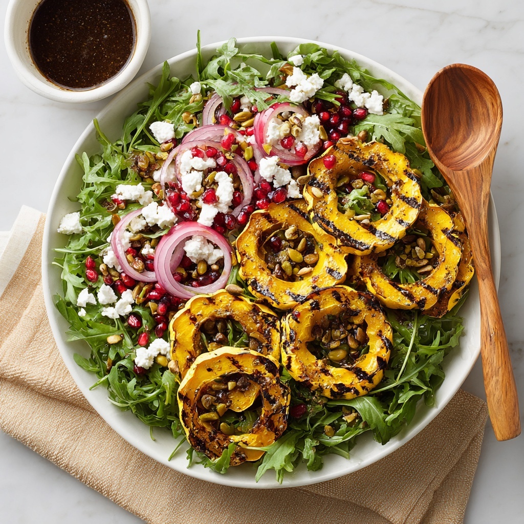 For a stunning presentation, serve the salad in individual clear glass bowls or on large rustic wooden platters to showcase its vibrant colors. Layering the ingredients artfully rather than tossing immediately lets guests admire the bright arugula, jewel-like pomegranate arils, and golden squash before all those wonderful flavors mingle.