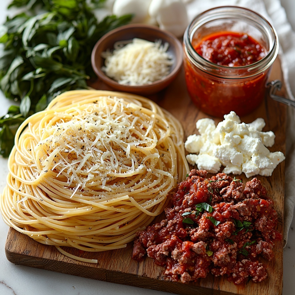 The ingredients for this Easy Baked Spaghetti Recipe are wonderfully straightforward but each plays a crucial role in building layers of flavor and texture. From the al dente pasta to the creamy, melted cheeses and savory seasoned meat sauce, every item is essential for creating that irresistible baked pasta experience.
