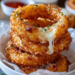 For a fun party presentation, serve the rings stacked in a rustic wire basket lined with parchment paper alongside dipping sauces like marinara, ranch, or spicy aioli. You can also thread several rings on skewers to create cheesy onion ring “lollipops” for an eye-catching appetizer platter.