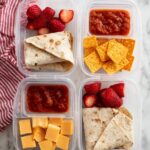 - Divide Ingredients: Evenly distribute the prepared burritos, salsa, cheese cubes, strawberries, and cheese-its among 4 lunchboxes to ensure balanced portions.