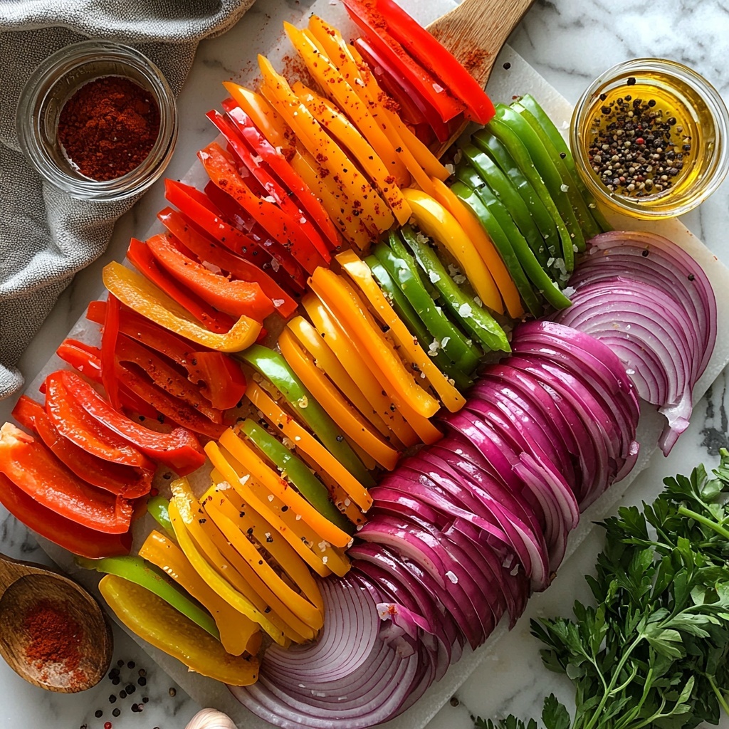 Start by thinly slicing your red, yellow, and green bell peppers along with the red onion. The goal is to create strips that cook evenly and look beautiful when served. Keep the slices uniform for consistent texture throughout the dish.