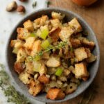 This stuffing partners beautifully with classic Thanksgiving mains: turkey, ham, or a roasted vegetable platter. Add creamy mashed potatoes and tangy cranberry sauce, and you have a holiday plate filled with contrasting textures and complementary flavors that everyone will rave about.