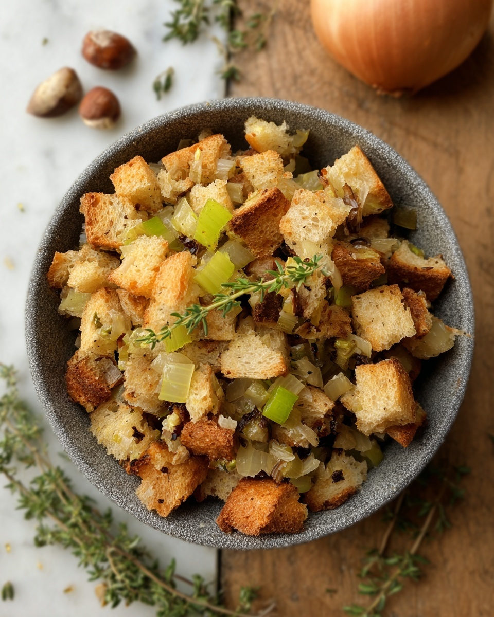 - Fresh thyme, 1 tablespoon chopped: Infuses an earthy, slightly floral flavor that’s essential to classic stuffing.