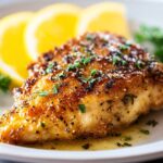 After cooking, let the chicken rest for about 5 minutes to allow the juices to redistribute and the internal temperature to stabilize at 165°F (74°C). This resting period ensures every bite is juicy and tender. Finally, add some fresh parsley and lemon wedges on top for that extra burst of color and brightness which complements the dish perfectly.