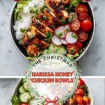 Serve the Harissa Honey Chicken Bowls Recipe in rustic ceramic bowls or colorful plates to highlight the vibrant ingredients. For a fun twist, serve the chicken and rice salad separately, letting everyone build their own bowls. You can also swap out the rice for quinoa or couscous for different textures while keeping all those signature flavors intact.
