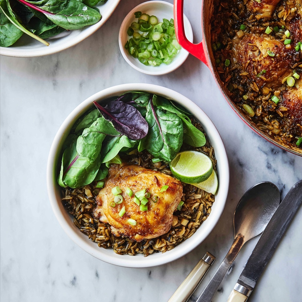 For a fun twist, serve this dish family-style right out of the pot at the table—there’s something inviting about digging into a beautifully spiced one-pot meal. Alternatively, place a mound of the rice on each plate and artfully arrange chicken thighs on top, garnished with scallions and a wedge of lemon for squeezing.