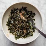 Next, you want to awaken the nori’s flavor and texture. Hold each sheet briefly over a medium flame on your gas range or toast them gently in the skillet. This quick toasting crisps up the seaweed and releases its distinct flavor. Once toasted, crumble the nori into small, delicate flakes and mix them with the toasted sesame seeds in the bowl. The combination of black and white, crispy nori and seeds already starts to look and smell mouthwatering.