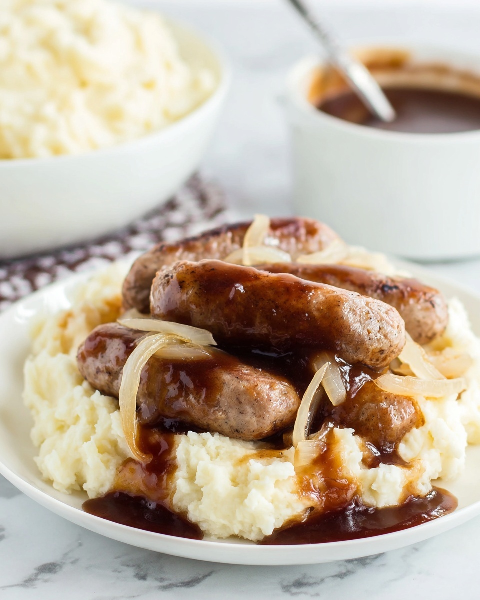 - Assemble: Serve the mashed potatoes on plates topped with a sausage link and some sautéed onions. Drizzle the warm gravy over the top for a classic finishing touch.