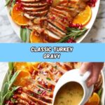 This classic turkey gravy recipe is made from savory pan drippings, enriched with butter, herbs, and flour to create a smooth, flavorful sauce perfect for Thanksgiving or any roasted turkey dinner.