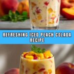 A refreshing and creamy Iced Peach Colada made with frozen peaches, pineapple juice, and coconut milk, perfect for a tropical summer treat. This easy-to-make beverage can be enjoyed as a mocktail or cocktail with the addition of white rum, offering a sweet and frosty delight garnished with peach slices and shredded coconut.