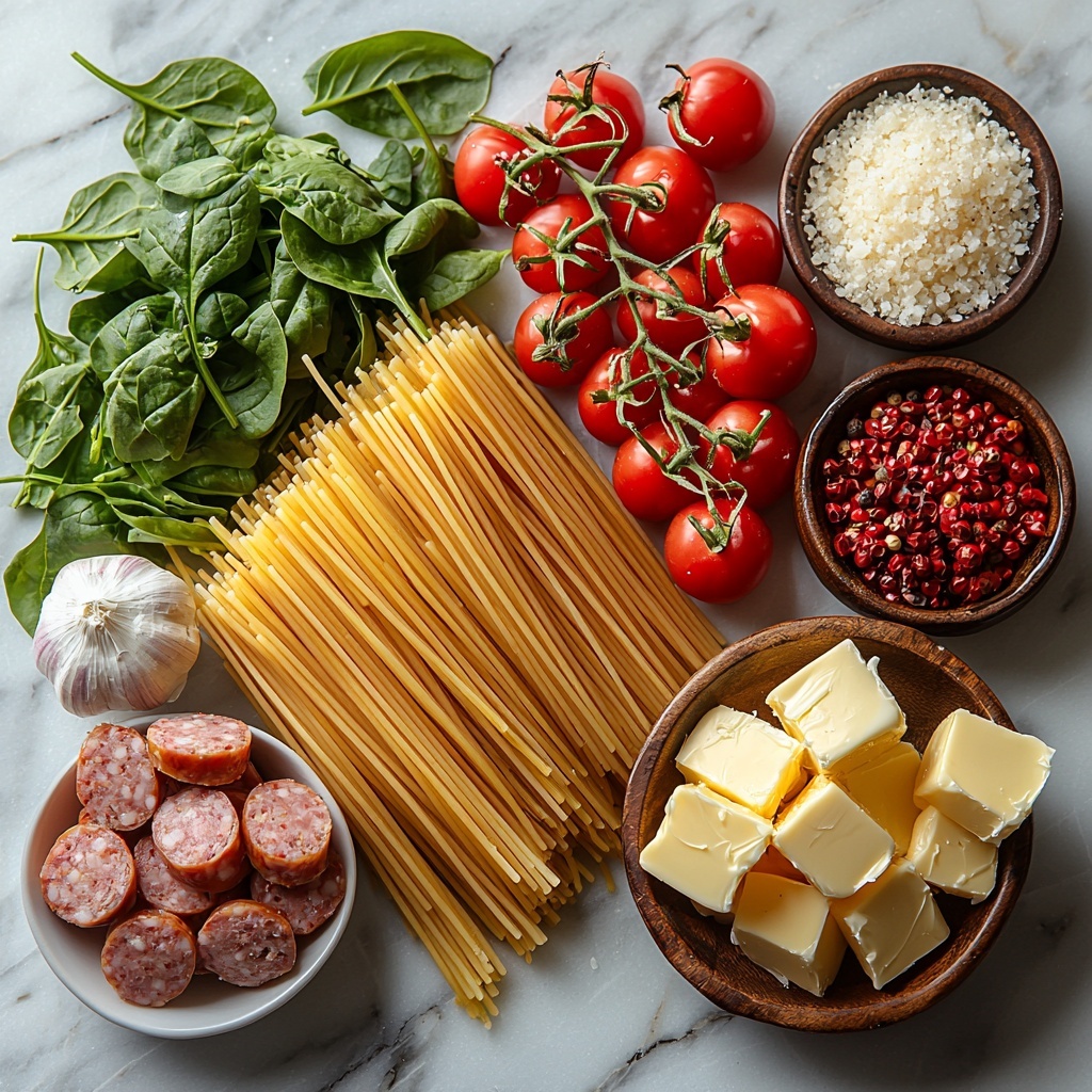 This Indulgent Garlic Butter Spaghetti with Cheesy Italian Sausage is a rich and flavorful pasta dish perfect for a comforting dinner. Tender spaghetti tossed with savory Italian sausage, fresh spinach, juicy cherry tomatoes, and melted Parmesan cheese creates a creamy, satisfying meal with a delicious garlic butter sauce.