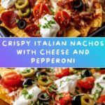 Italian Nachos are a creative twist on traditional nachos using crispy fried pasta chips topped with marinara sauce, melted mozzarella and Parmesan cheeses, pepperoni, black olives, and fresh basil. This appetizer or snack is perfect for sharing and offers a delightful combination of crunchy texture and savory Italian flavors.