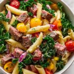 A vibrant and hearty Kale Pasta Salad combining al dente penne with crisp kale, savory salami, sweet little tomatoes, and a tangy, garlicky red wine vinaigrette. This dish offers a perfect balance of textures and flavors, ideal as a refreshing lunch or a satisfying side.