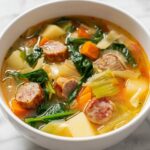 This hearty Kielbasa Soup is a comforting blend of smoky Polish sausage, fresh vegetables, and flavorful seasonings simmered to perfection. With tender potatoes, crisp celery, cabbage, and vibrant spinach, this soup is the perfect one-pot meal for chilly days, offering warmth and satisfying flavors in every spoonful.