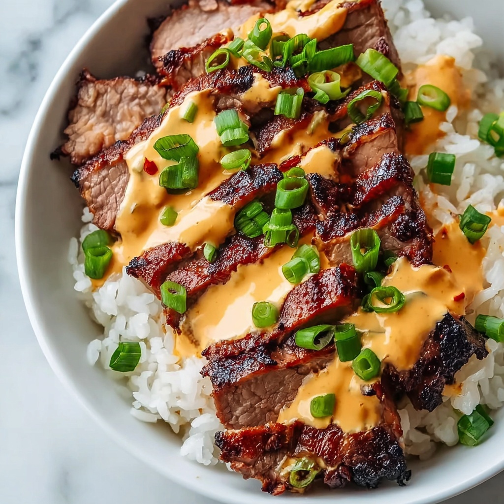 - Assemble the Bowls: Spoon a serving of cooked rice into each bowl. Top with the grilled or pan-seared steak cubes, then drizzle generously with the spicy cream sauce for a flavorful finish.