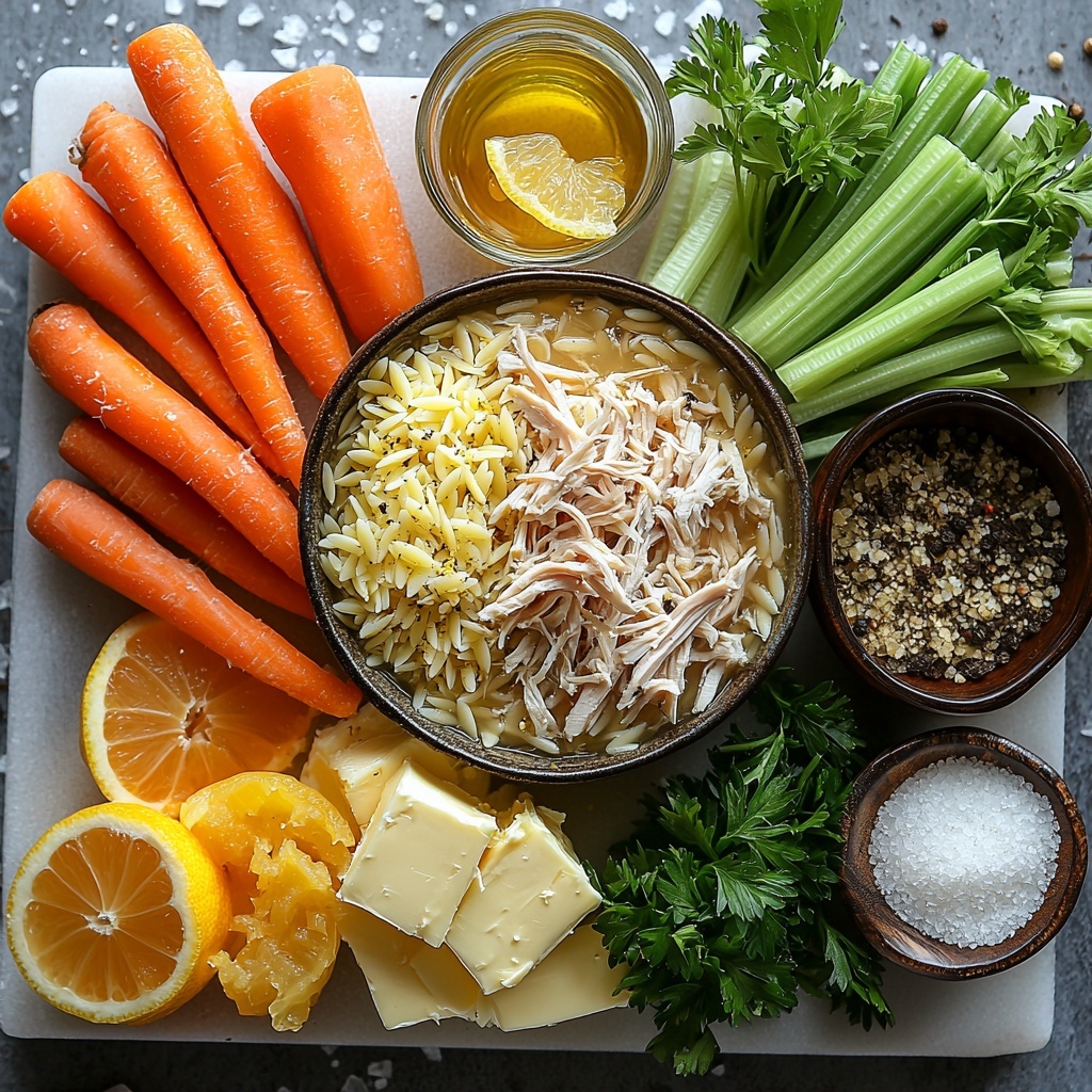 This Lemony Chicken Orzo Soup Recipe relies on straightforward, everyday ingredients that combine beautifully to create layers of flavor and texture. Each component plays an essential role, adding freshness, creaminess, or that signature lemony brightness that makes this soup unforgettable.