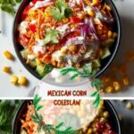 A vibrant and creamy Mexican Corn Coleslaw combining shredded cabbage and sweet corn kernels tossed in a tangy lime mayonnaise dressing, seasoned with chili powder, cumin, and fresh cilantro, then topped with crumbly cotija cheese. Perfect as a refreshing side dish to complement your favorite Mexican meals.