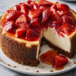 This Next Level Baked Strawberry Cheesecake features a creamy, smooth cream cheese filling over a buttery digestive biscuit crust, topped with a glossy, fresh strawberry compote. Baked in a water bath for perfect texture and chilled overnight, it offers a luscious and elegant dessert perfect for any occasion.