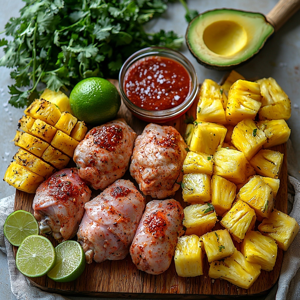 These One Pan Chicken & Pineapple Tacos combine juicy marinated chicken thighs with fresh pineapple chunks for a sweet and smoky flavor. Perfectly roasted in the oven, the chicken is tender and infused with chipotle, honey, and lime, complemented with fresh shallots, avocado, and warm tortillas for a vibrant and easy taco meal.