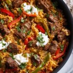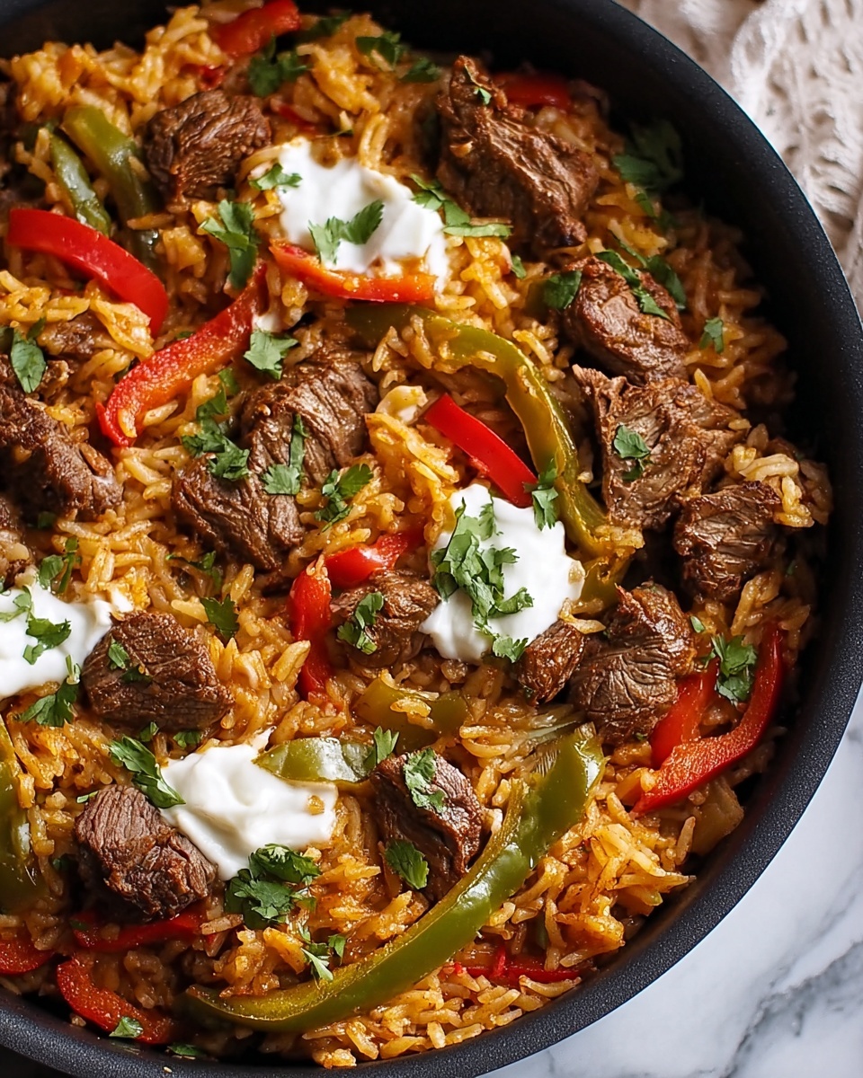 This One Pan Steak Fajita and Rice Skillet is a flavorful, easy-to-make dinner that combines tender, seasoned steak with sautéed bell peppers, onions, and perfectly cooked rice—all in one skillet. The dish is finished with a zesty lime juice and fresh cilantro garnish, making it a vibrant and satisfying meal inspired by classic fajita flavors.