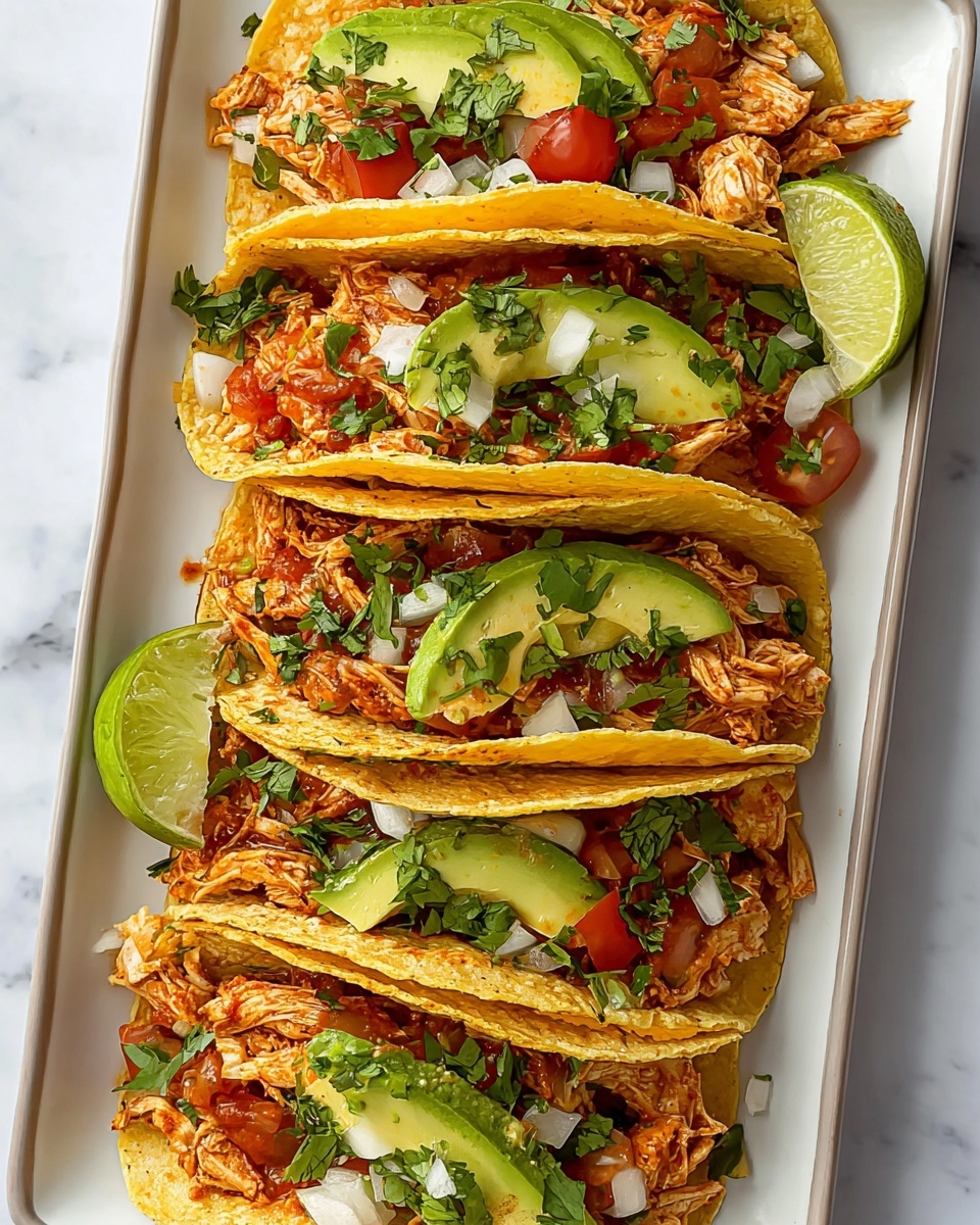 - Assemble Tacos: Fill each crispy taco shell with shredded chicken, then top with shredded cheese, shredded lettuce, diced tomatoes, sliced avocado, a drizzle of sour cream, and chopped fresh cilantro for layered freshness and creaminess.