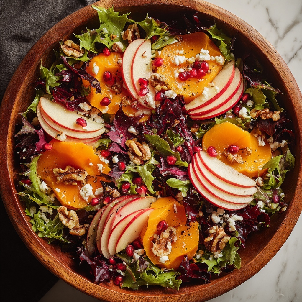 A refreshing Persimmon and Apple Salad featuring a vibrant cider vinaigrette, mixed greens, crunchy nuts, and optional creamy feta. This salad combines sweet, tart, and savory flavors with a delightful crunch from candied walnuts and pomegranate seeds, perfect as a light lunch or a colorful starter.