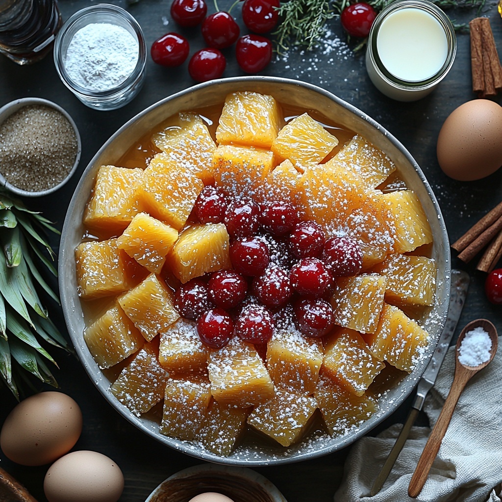 First, preheat your oven to 350°F (175°C) and generously grease a 9-inch round baking dish. This ensures your cake will turn out with a beautiful caramelized top once flipped. Next, sprinkle the brown sugar evenly across the bottom of the dish—a key step for creating that irresistible caramel layer—and arrange pineapple rings and cherries in an inviting, eye-catching pattern.