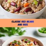 A hearty and flavorful Red Beans and Rice recipe featuring tender red kidney beans simmered with aromatic vegetables and spices, served over fluffy white rice. This comforting dish is perfect for a wholesome family meal.