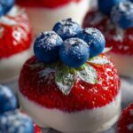 These Red, White, and Blue Cheesecake Strawberries are a patriotic and delicious no-bake treat perfect for summer celebrations and gatherings. Fresh strawberries are hollowed out and filled with a smooth, fluffy cream cheese filling, then topped with juicy blueberries to create a festive appetizer or dessert that’s both visually appealing and incredibly tasty.