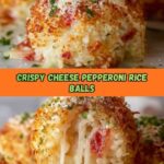 Deliciously crispy Rice Balls with melted cheese and savory pepperoni, perfect as a flavorful appetizer. These fried rice balls combine creamy mozzarella, grated Parmesan, and zesty seasonings to create a satisfying snack or party dish served warm with marinara sauce.