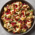 This vibrant Middle Eastern-inspired roasted cauliflower recipe features golden, tender florets seasoned with cumin and smoked paprika, topped with a creamy garlic tahini sauce and garnished with juicy pomegranate seeds and fresh parsley. It makes a delicious vegan and gluten-free side dish that’s both flavorful and nutritious.